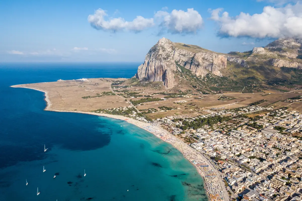La plage de San Vito Lo Capo s’étend sur environ 3 kilomètres le long de la côte nord-ouest de la Sicile, baignée par les eaux cristallines de la mer Méditerranée. Ce qui rend cette plage si spéciale, c’est son sable blanc et fin qui s’étend sur toute sa longueur, créant un contraste spectaculaire avec la mer turquoise qui l’entoure.